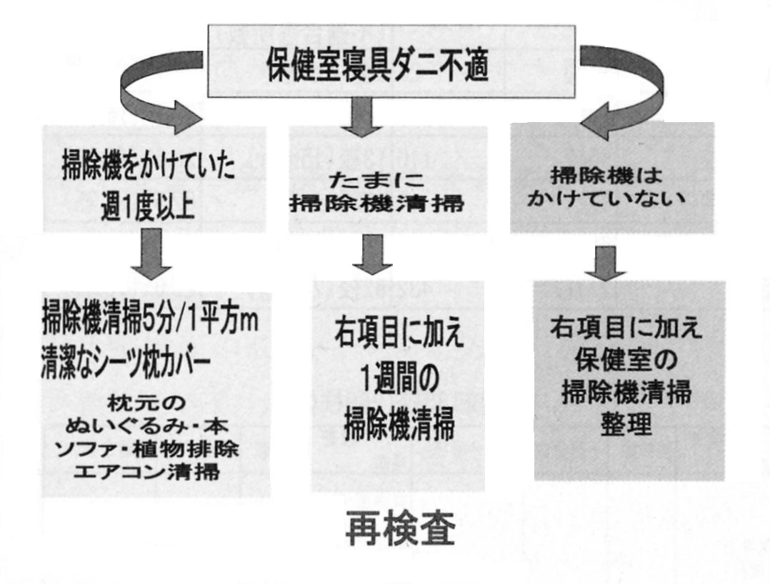 先日大阪で開催された第61回指定都市学校保健協議会の課題別協議会で「学校保健室寝具における効果的ダニアレルゲン除去指導について」という題名で京都市の学校薬剤師が発表されました。以下、講演要旨より抜粋。学校環境衛生基準に適合したマイティチェッカーは、Der2(ダニ)とDer1(ダニの死骸、ダニの糞)を発色させるものであり、生きたダニを測るものではない。しかし、結果判定には3+でダニ350匹以上相当と表記され、まるで生きたダニが多く存在するような誤解を招いている。また、防ダニグッズの有効性に疑問もあり、薬剤散布や、天日干しだけの対策では基準にいたらない。そこで従来より推奨されている方法の他に「防ダニ」を謳った商品を使った方法など種々の方法を検討し効果を検証し、学校現場で実際に継続して実施可能な方法を提言する。 結果(条件により異なります) 1.布団天日干し1時間では、ダニは死滅してもアレルゲンは残る 2.天日干し+掃除機での吸引除去法では、掃除機をかけることで有効 3.ダニ除去布団袋(黒)に入れての天日干し(1時間)では、黒の袋に入れるた め、天日干しするだけより有効のはずだが日照不足で微妙 4.市販のダニ除去グッズ アルバスター使用(猫とともに寝ている被験者宅で 1ヶ月)では、ダニ取りシートには捕獲されずシート下の寝具にダニが集まっ ていた 5.防ダニシーツ使用では、シーツの目が細かいため有効。寝具にアレルゲンは 残る 6.洗濯したふつうのシーツ使用では、有効 7.業者による布団丸洗いでは、丸洗いしてもゼロにはならなかった また、ホコリとダニアレルゲン検査結果から「検体中のホコリの量」と「ダニアレル ゲンの量」が相関関係を示すことも明らかとなった。 学校保健室寝具の衛生管理は養護教諭個人の問題とされることが多い。学校 の理解を得るために、効果的除去法であることを示す根拠と、不適判定を受けた 時のフローチャートを示すことにより、定期的な保健室寝具の衛生管理が実施さ れると考えられる。 ・日常の清掃状況を確認(状況毎に右の図 ![]() の対応決定) ・ダニのライフサイクル(1習慣で孵化) から週1回の掃除機清掃が効果的である 事の説明 ・検査時の集塵量を示し、ほこりの量とダ ニが相関することを説明 ・汚染時のみの寝具洗濯より週1回の寝具 取替を助言 ・定期的天日干し、特に梅雨前、夏休みが効果的であることの助言 ・ぬいぐるみなどの配置見直し、エアコン清掃 ・日常的に環境整備が行えるための個別支援(養護教諭だけの負担にならないよ う配慮を) 指導ポイント3原則 (1)増やさない(通風、換気と掃除機清掃) (2)やっつける(熱湯処理、薬剤散布と掃除機清掃) (3)持ち込まない(ぬいぐるみ、ソファー、ベッド下清掃、エアコンフィルター管理) |